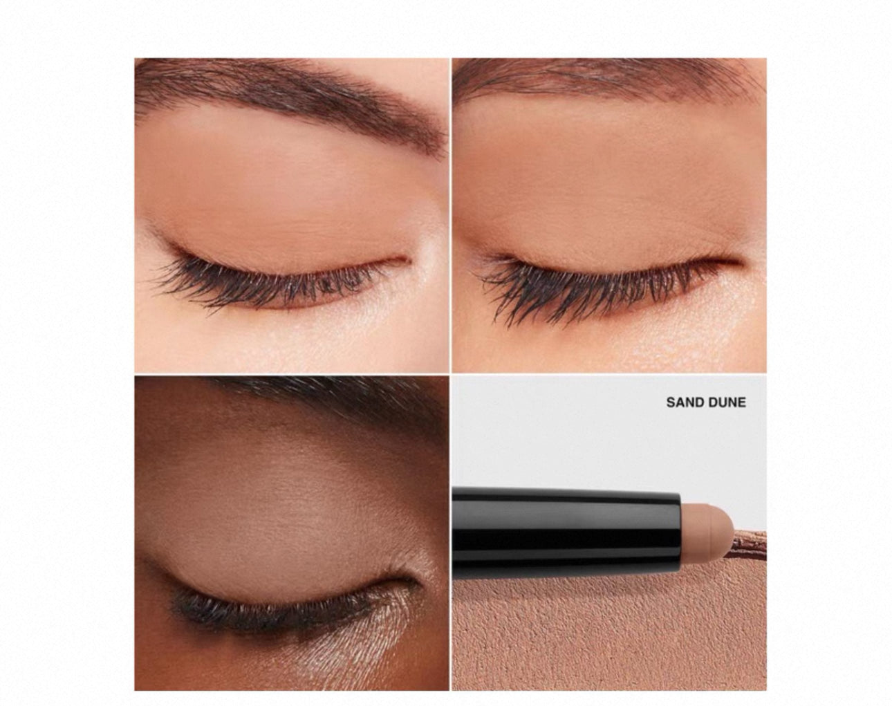 塗抹於眼皮上,以指尖輕易地暈染。或使用膚色色號打底,奪目色號提亮眼妝。