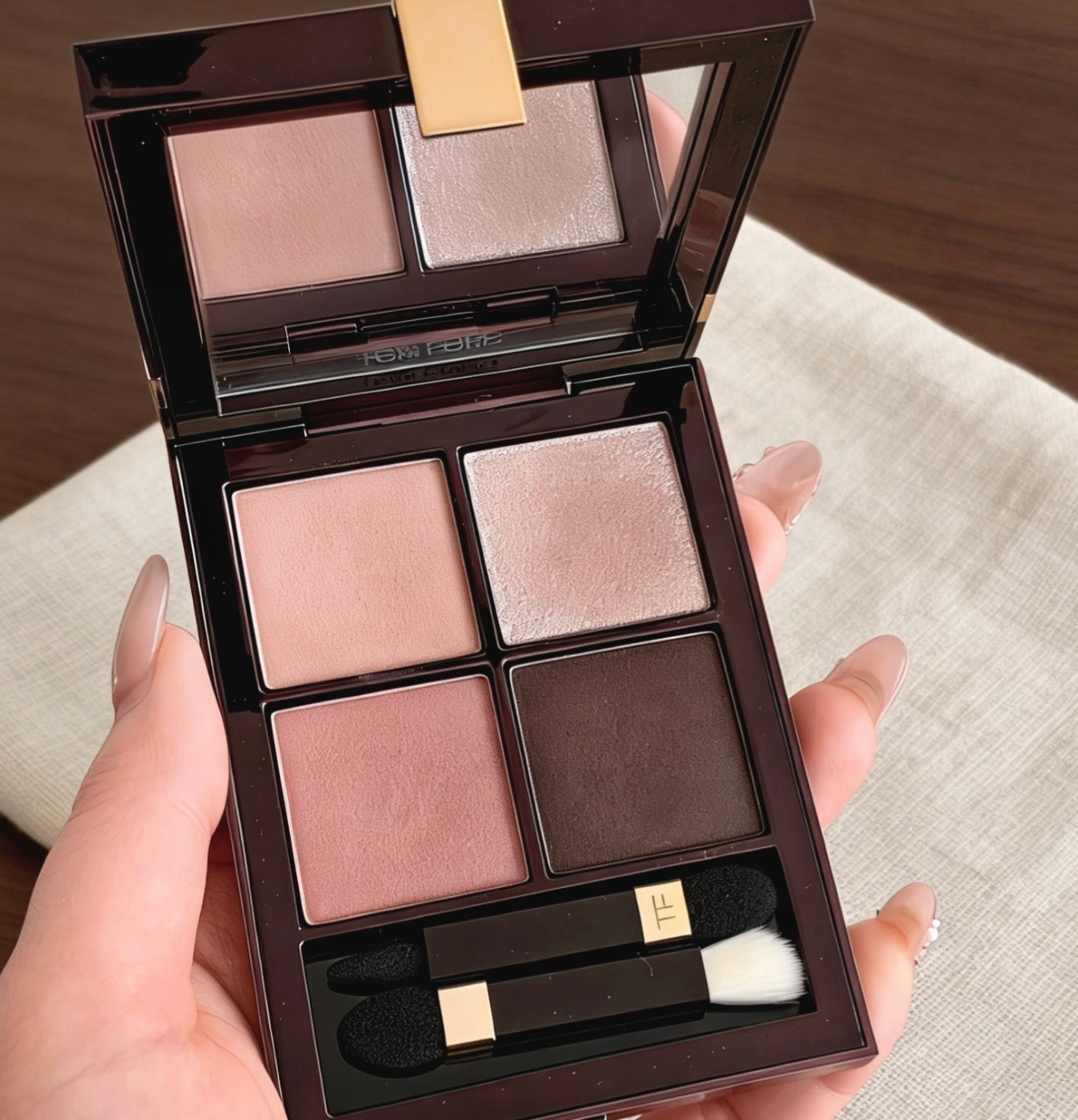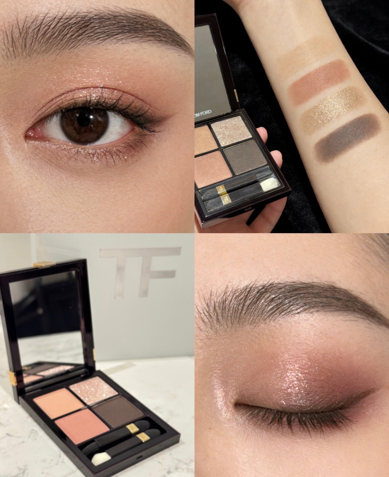 左上角那顆閃片是 TF 的靈魂。新版粉質更顯通透,輕點在眼皮中央,瞬間折射出如同碎鑽般的濕潤光澤。那種「眼波流轉、星光閃爍」的氛圍感,是其他品牌完全無法復刻的。